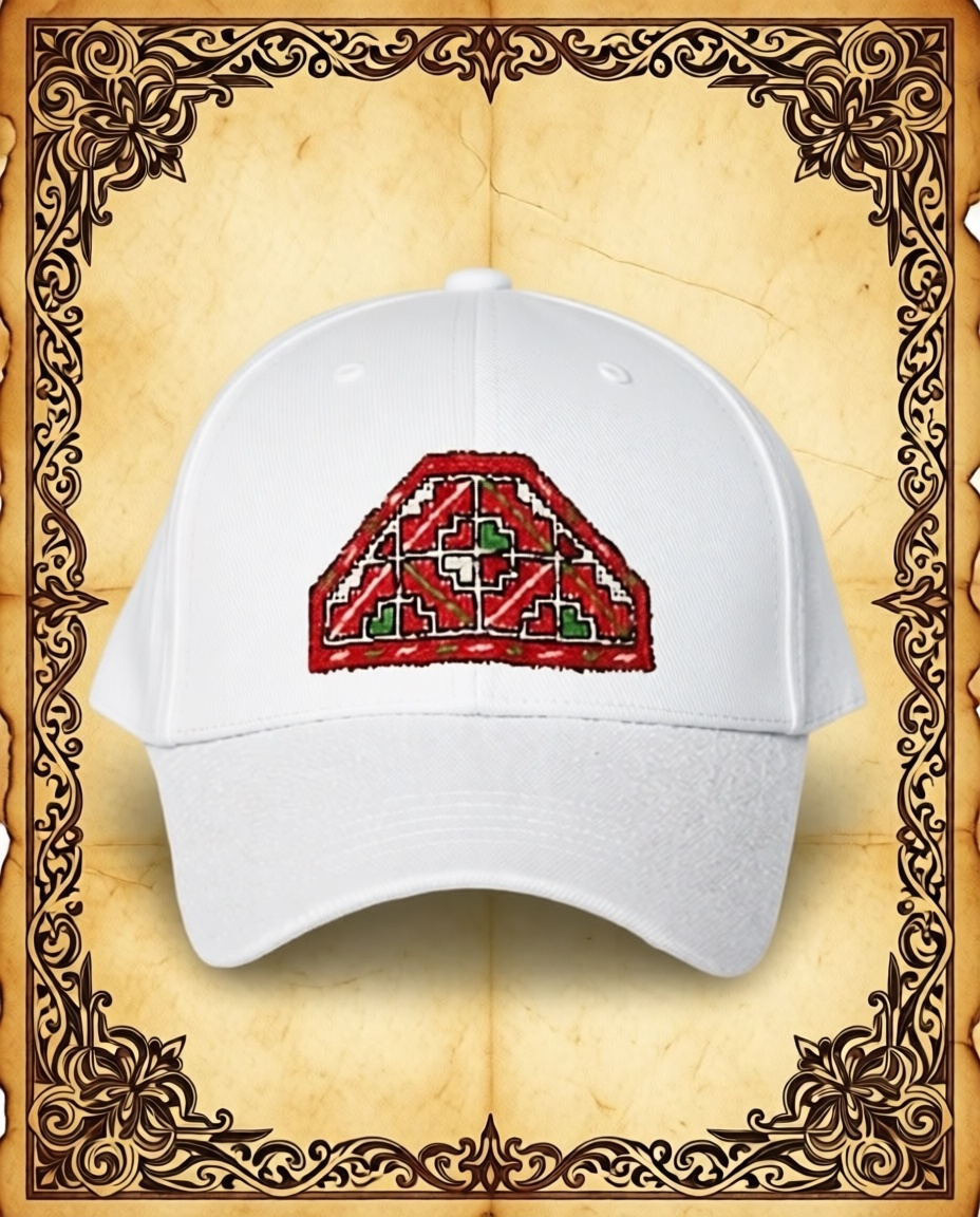 Кепка с нашивкой, выполненной в технике башкирской счетной вышивки.